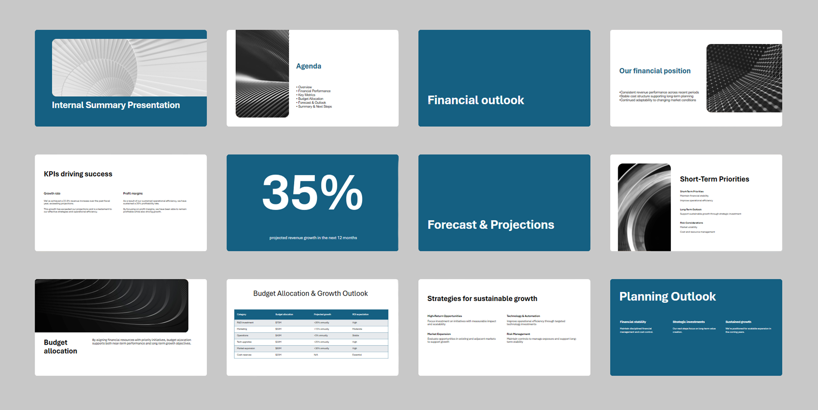 PowerPoint deck design focused on clarity, hierarchy, and data-driven communication for internal and client-facing presentations.